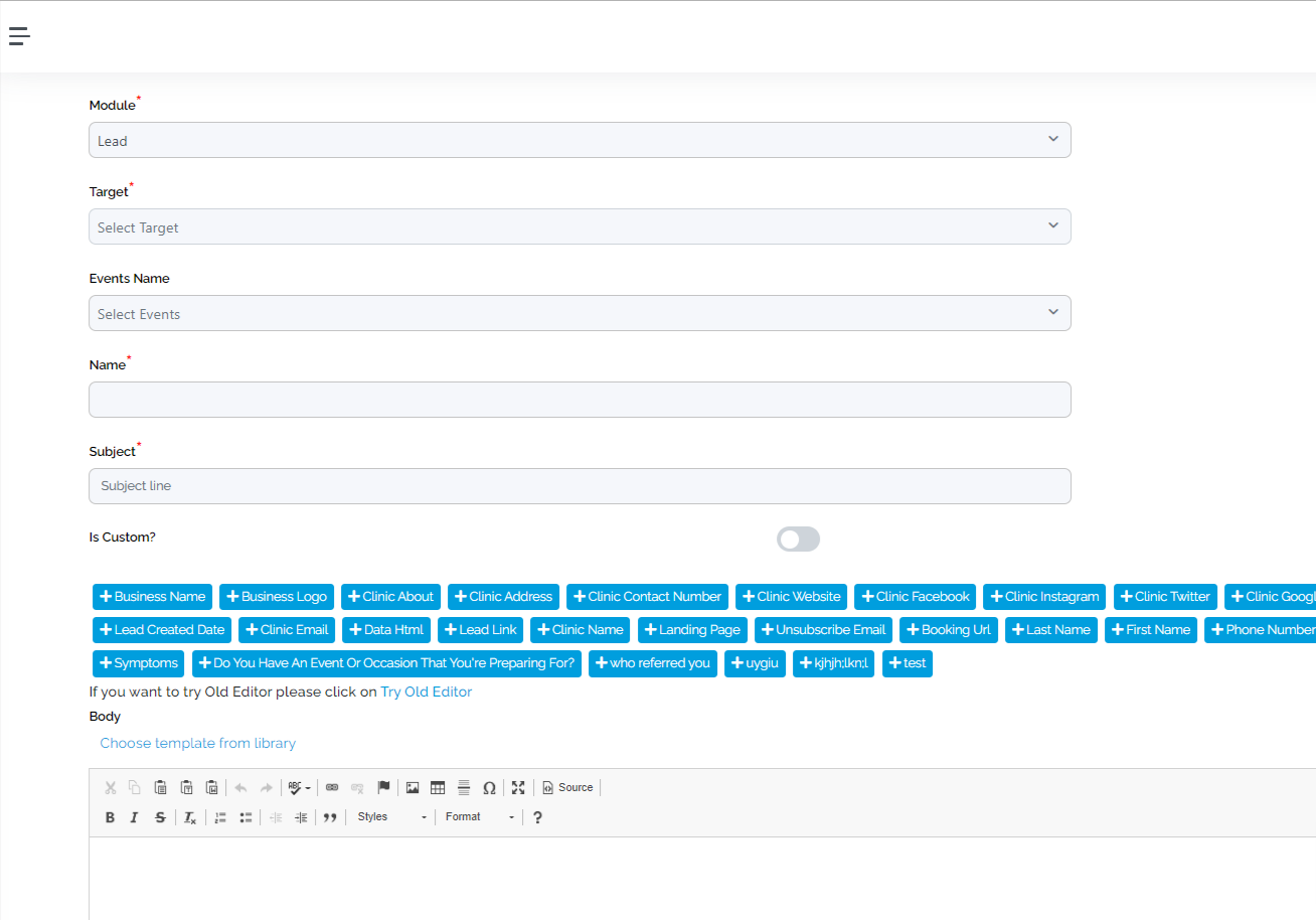 Refer to the below image for more clarity. All the blue rectangle-shaped menus seen below the "Is Custom" check box are the pre-defined variables that you can choose from. Please ensure that you only choose from the below variables only. For editing, always click on "Try Old Editor" and do all the editing.