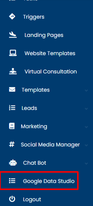 With the code in place, and once saved successfully. A new menu titled "Google Data Studio" now appears in the main menu bar of your admin panel. Click on the menu button to visit the main page of "Google Data Studio".
