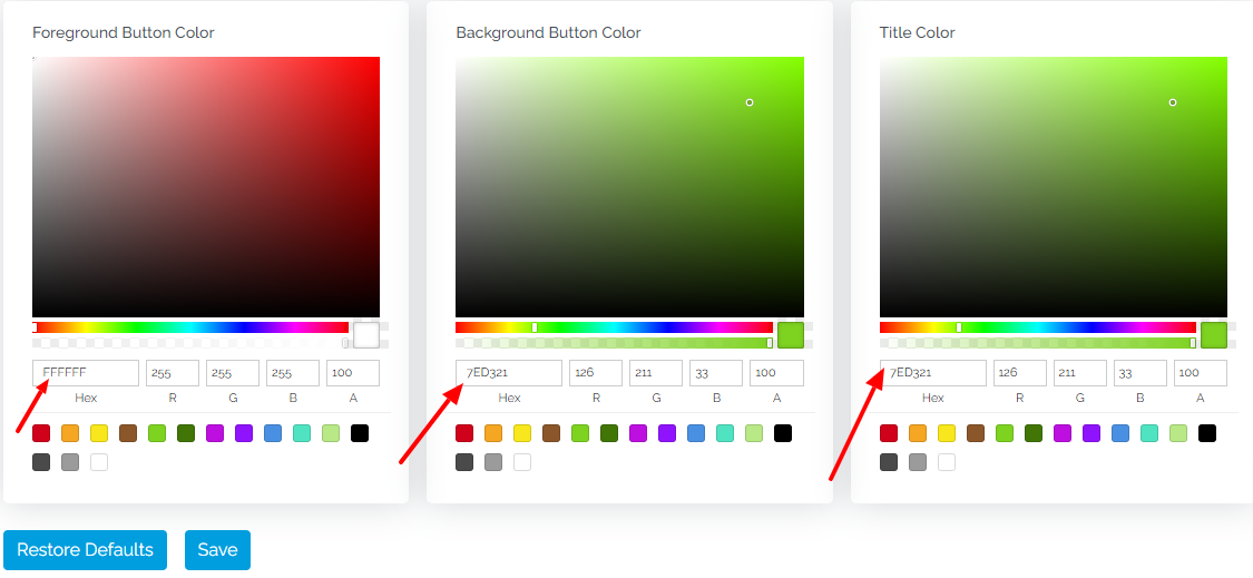 Under the palette box that says "Background Button Color", add the Google Hex Code you want to apply. We have chosen "7ED321" as the background color.