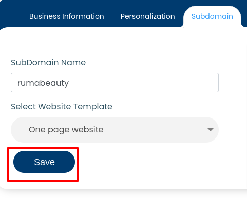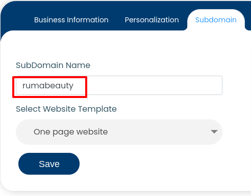 If your subdomain already has a title, it will be displayed in the data field titled "Subdomain". To change the name of the subdomain, type another suitable name of your choice in the data field. Please ensure that the name you type is closely related to the name of your business website, as it will reflect in the URL on your website template. Refer to the below image.