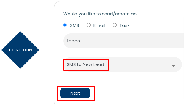 In the next step, we need to add the conditions. In this case, it will be SMS. From the dropdown choose the trigger target as "Leads". Select the SMS template of your choice, we have selected the one titled "SMS to new lead".