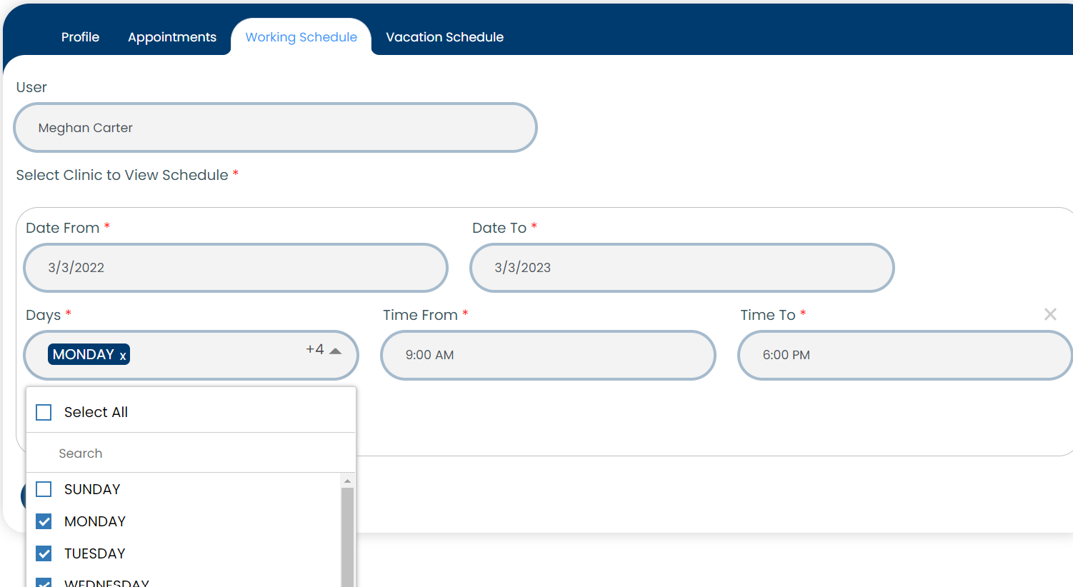 Once the services are selected, next click on the working schedule tab to set up the provider's working schedule.
