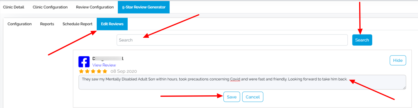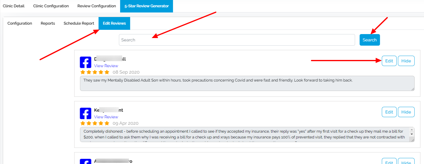 Here you can fetch reviews from your Facebook, GMB or Yelp profiles, generate reports, schedule a time to get reports in your clinic notification email address on monthly basis and also edit the reviews accordingly if needed.