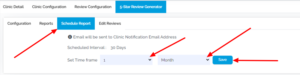 If you want to automate receiving the review reports to your clinic notification email address daily, weekly or monthly, that can also be done here in the "Schedule Report" tab; refer the screenshot below.