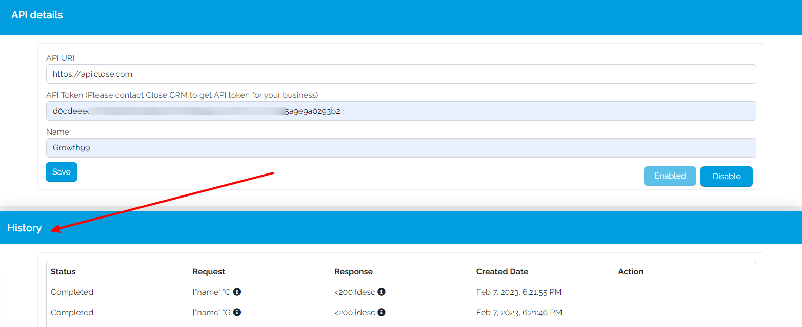 Under both columns, there is a black info icon with each entry. Hover or click on it, and it will show what request was sent and what response receive from Close API.
